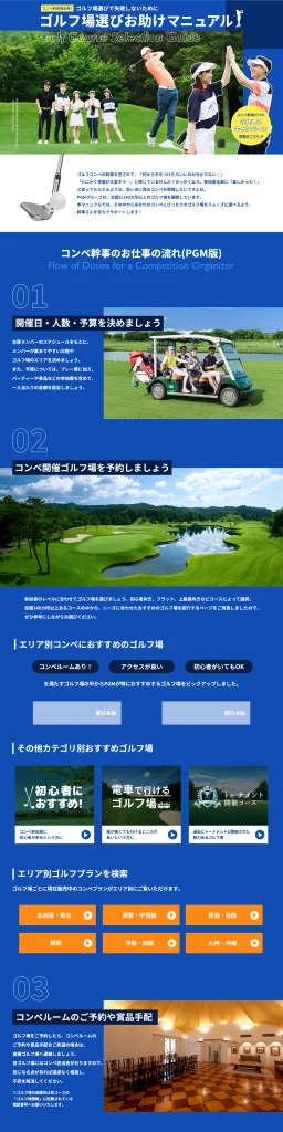 ゴルフコンペは企業の幹事が担当することが多く、30代の男性が多い。そのためページテイストを30代男性に置いた。ゴルフコースを約145コース運営する会社なのでこの中からユーザーがどういう視点で選ぶかという点で参考になるページへの誘導を目的としたまとめページにした。