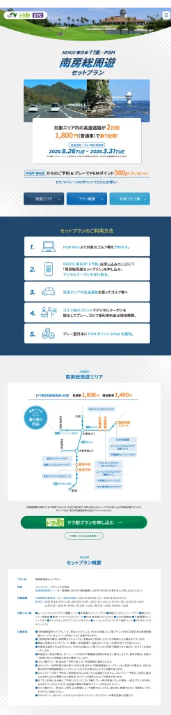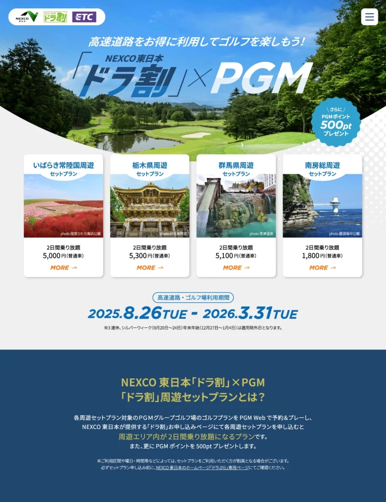 NEXCO東日本の高速道路の割引とPGMのゴルフ予約を抱き合わせにしたコラボ企画。通年販売のゴルフプラン。